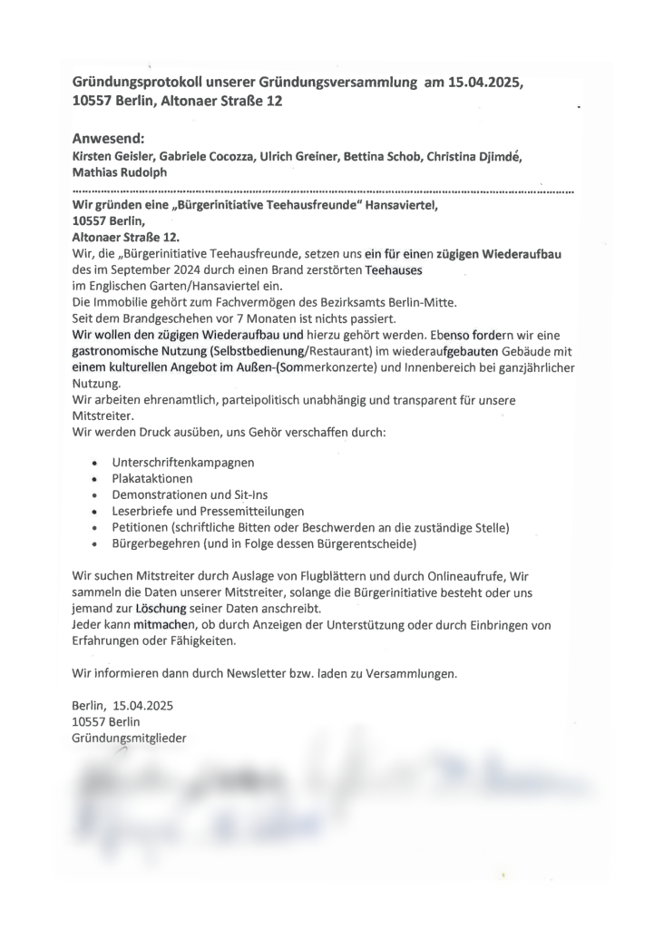um dieses Kleinod nach dem Brand schnellstmöglich zu schützen, zu sichern oder gar wieder aufzubauen. Ohne Schutzmaßnahmen muss das Teehaus in Folge abgerissen werden – ein Neuaufbau dauert Jahre. Um einen Wiederaufbau zu ermöglichen ist schnelles Handeln vom Bezirksamt notwendig.